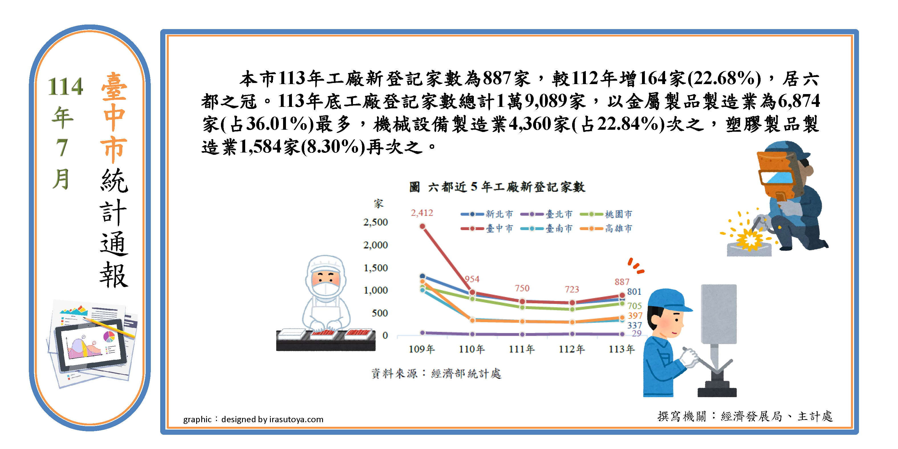 114年7月臺中市統計通報「臺中市工廠家數」發布囉!