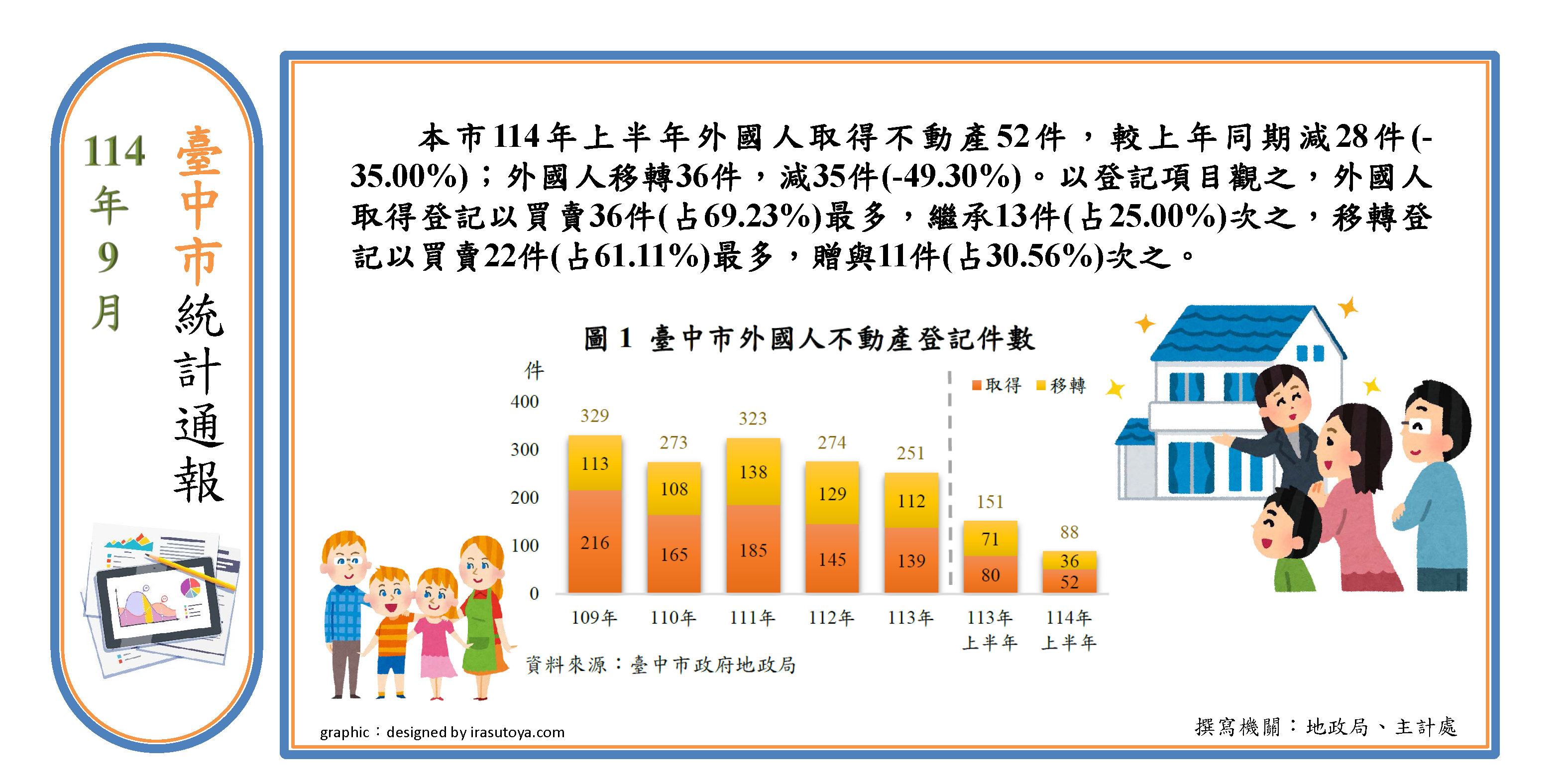 臺中市統計通報廣告圖(1140904) 本市114年9月統計通報「外國人不動產登記情形」公告,如需更多相關資訊可至主計處首頁 > 統計業務 > 公務統計 > 公務統計分析、通報 > 臺中市統計通報 查詢。