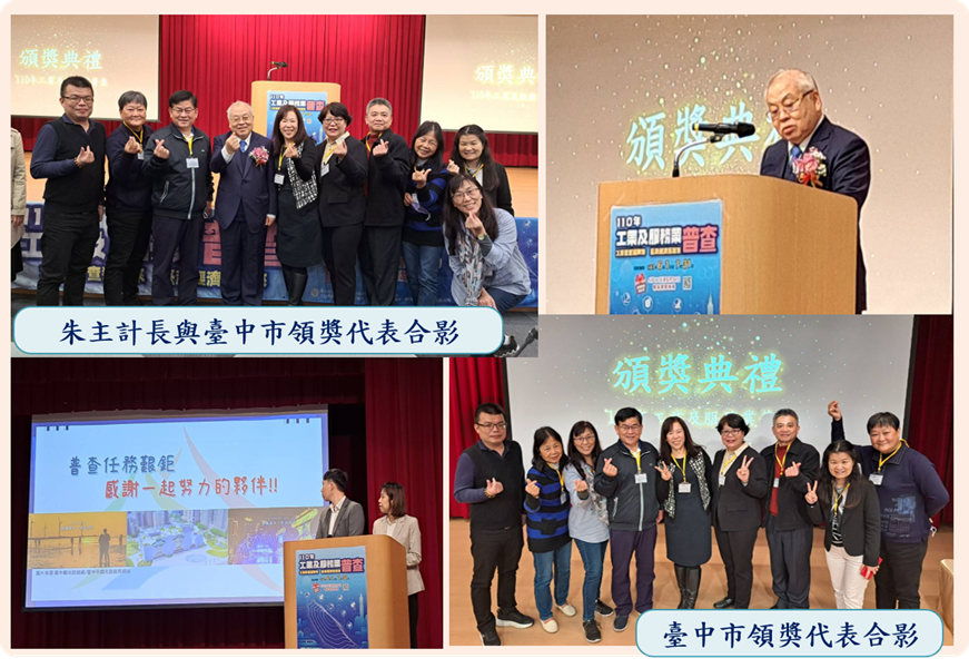行政院主計總處於本(112)年2月23日舉行「110年工業及服務業普查」績優組織頒獎典禮,由朱主計長澤民親自主持頒獎,頒予各級績優組織獎座及獎金。本市獲評為全國第一級市縣優等第一名,由主計處林處長淑勤代表領取獎座,另特優公所北屯區及南區,則由許繼協副區長及陳佩玉區長代表領取獎座。