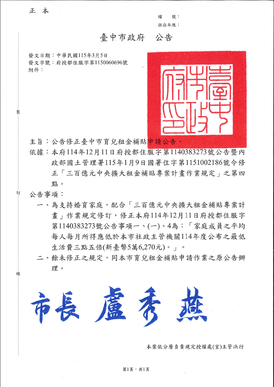 臺中市政府為支持婚育家庭,配合「三百億元中央擴大租金補貼專案計畫」作業規定修訂公告事項。