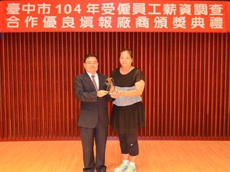 行政院主計總處為表揚104年(103年7月至104年6月)受僱員工薪資調查臺中市配合填報優良廠商,特於8月26日由臺中市政府主計處蔣處長建中在臺中市政府臺灣大道市政大樓4樓集會堂主持頒獎典禮,頒發精緻獎座1座,以表謝忱。