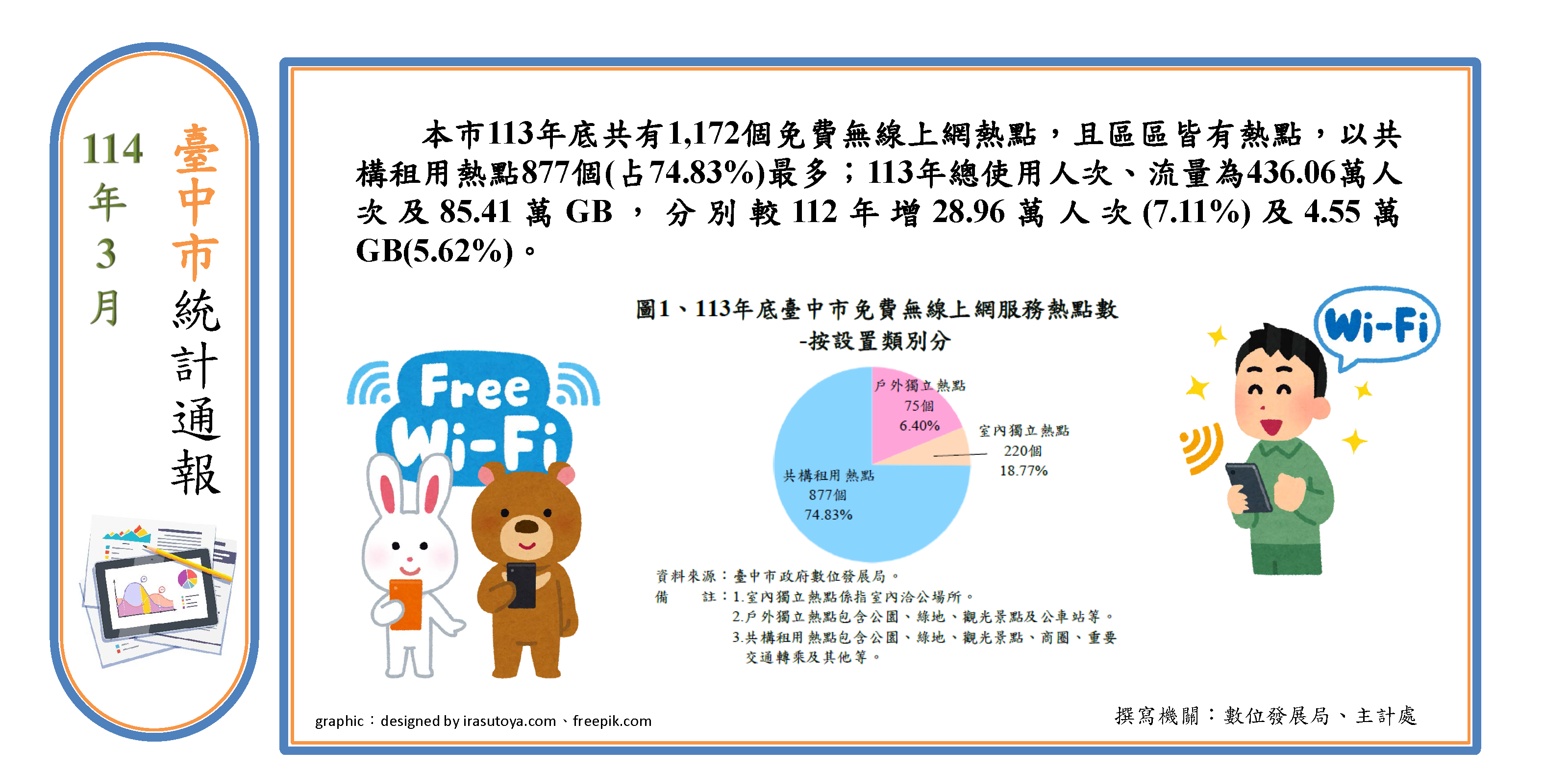 臺中市統計通報廣告圖(1140324) 本市114年3月統計通報「免費無線上網服務統計」公告,如需更多相關資訊可至主計處首頁 > 統計業務 > 公務統計 > 公務統計分析、通報 > 臺中市統計通報 查詢。