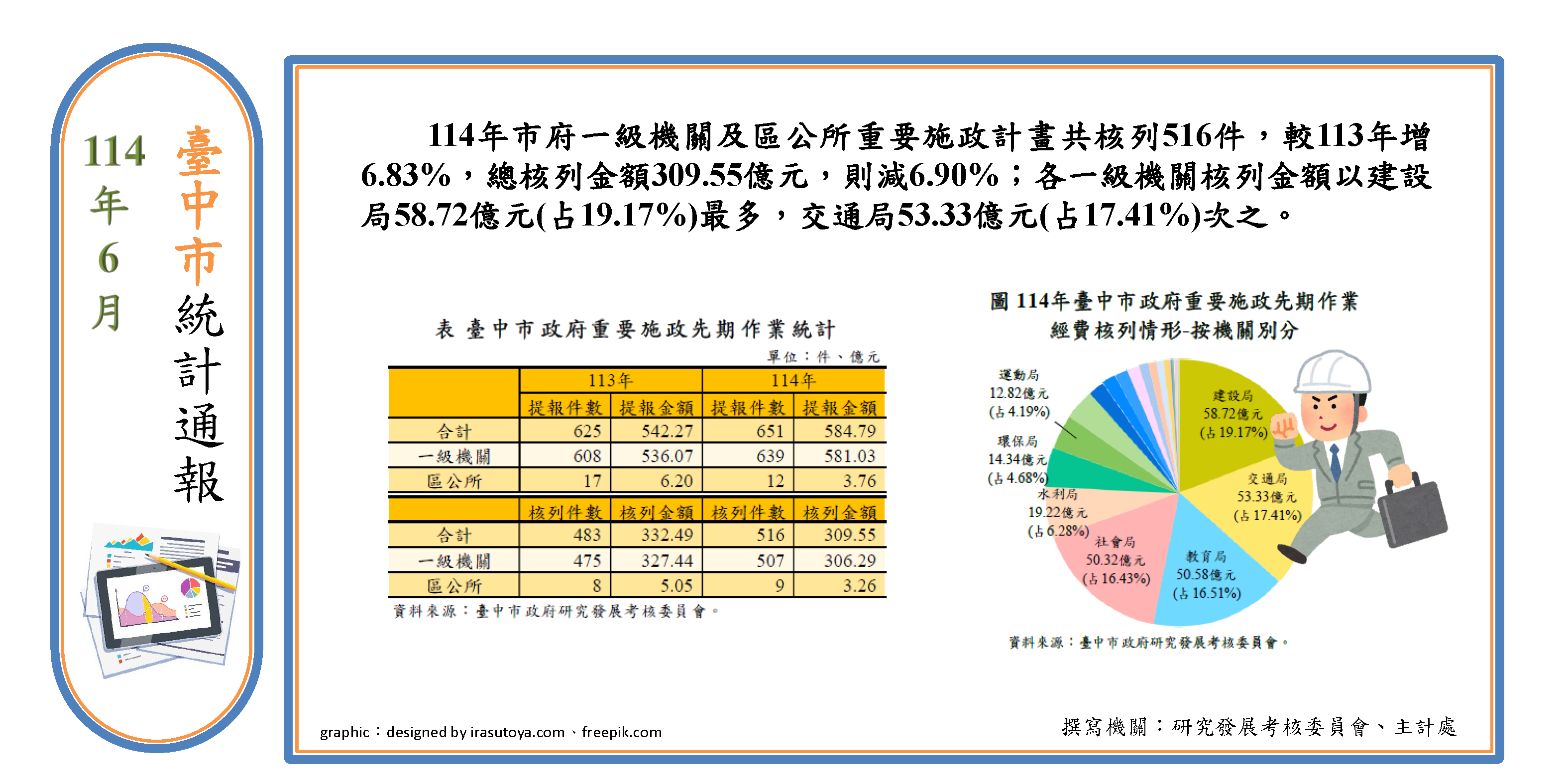 臺中市統計通報廣告圖(1140610) 本市114年6月統計通報「重要施政先期審議統計」公告,如需更多相關資訊可至主計處首頁 > 統計業務 > 公務統計 > 公務統計分析、通報 > 臺中市統計通報 查詢。