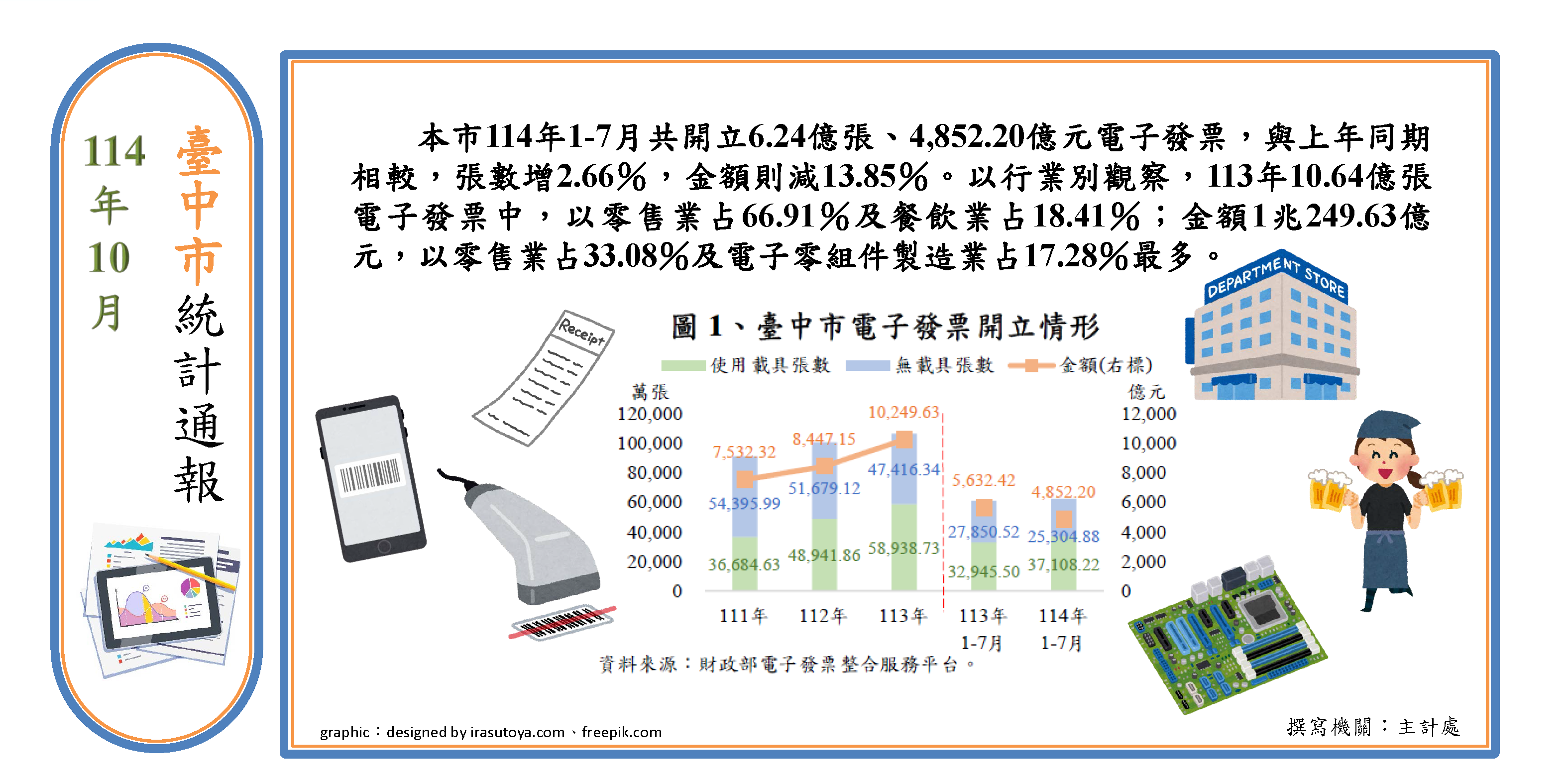 臺中市統計通報廣告圖(1141023) 本市114年10月統計通報「以電子發票開立看消費情形」公告,如需更多相關資訊可至主計處首頁 > 統計業務 > 公務統計 > 公務統計分析、通報 > 臺中市統計通報 查詢。