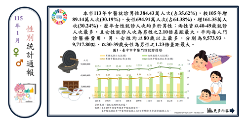本市115年1月性別統計通報「中醫就診情形」公告,如需更多相關資訊可至