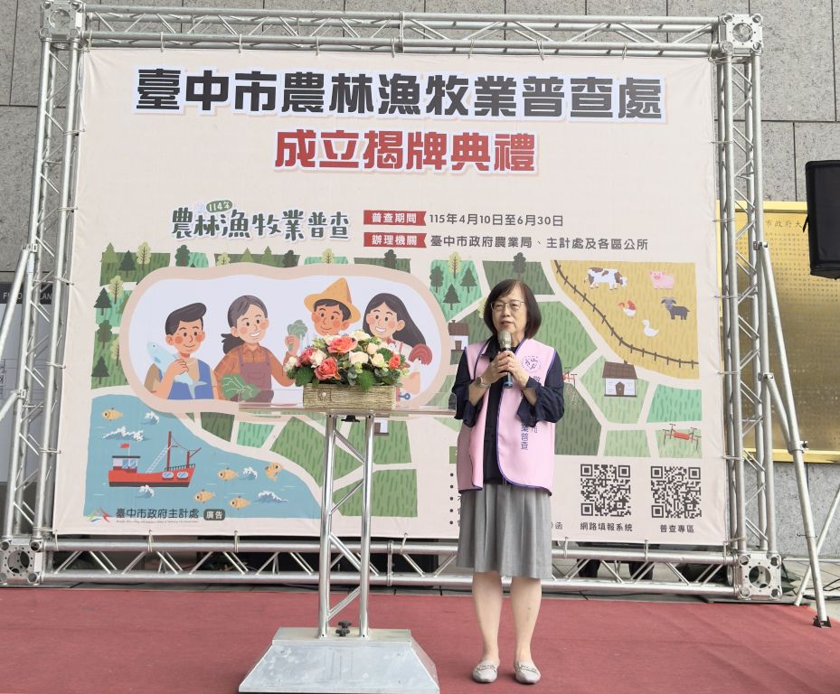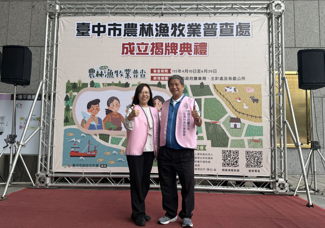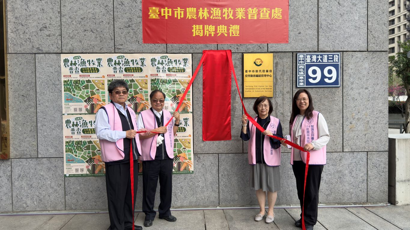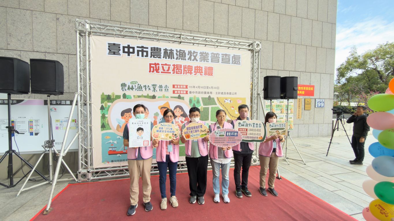「114年農林漁牧業普查」將於今(115)年正式展開,為順利推動普查工作,臺中市政府於今(2)日上午10時在市府大門口舉行「臺中市農林漁牧業普查處」揭牌典禮。典禮由賴副市長淑惠代表盧市長主持,並與民政局代理局長吳世瑋、主計處長林淑勤及農業局副局長蔡勇勝等人共同揭牌。此外,劉士州議員及林霈涵議員助理亦蒞臨現場指導,關心普查推動情形,展現對本市農業發展與基層農民權益的重視。賴副市長強調,農業是國家的根基,呼籲農民朋友配合支持,讓普查數據成為優化本市農業施政的重要依據。