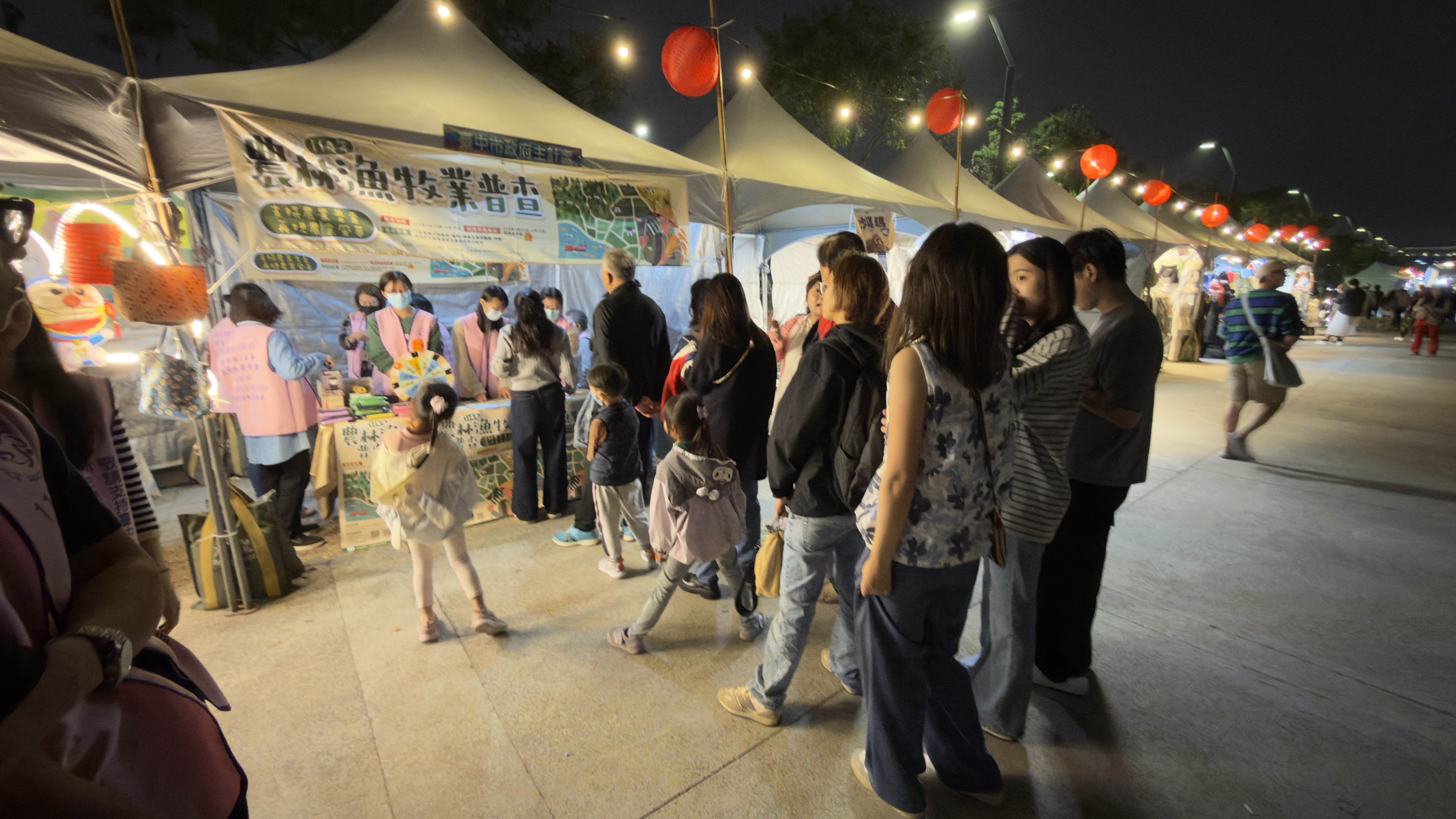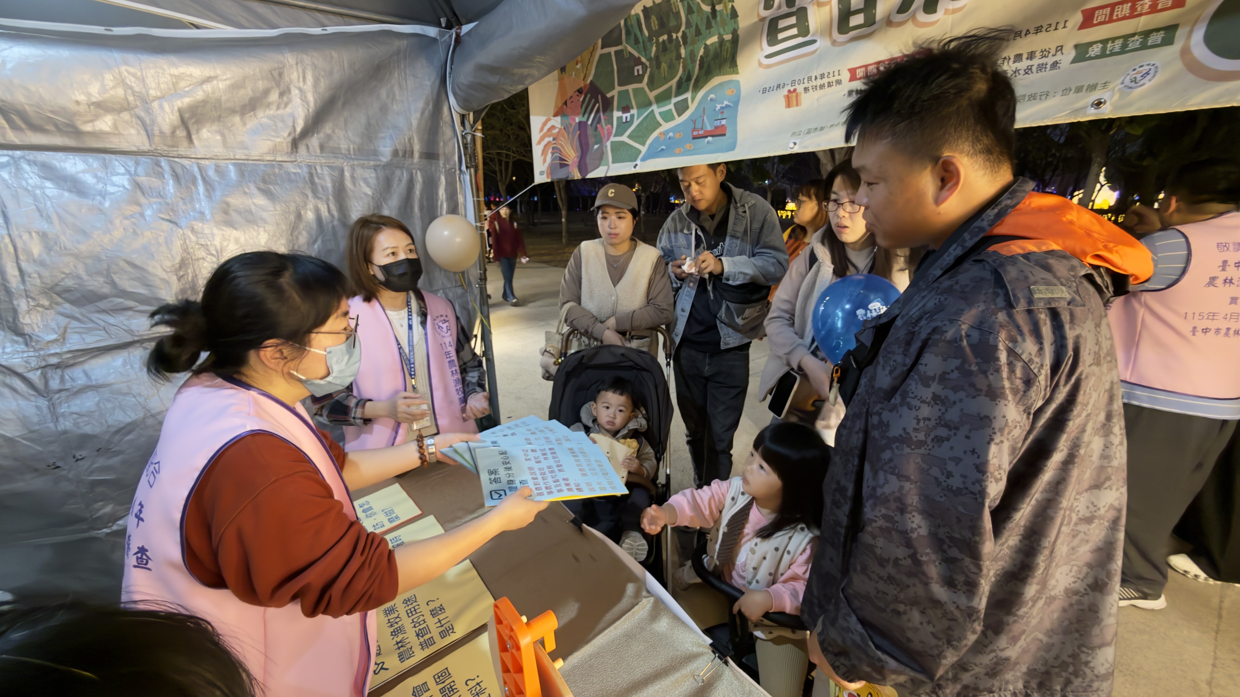 配合2026中臺灣燈會熱鬧登場,臺中市政府主計處於中央公園設置「114年農林漁牧業普查」宣導攤位,透過「抽牌配對及幸運轉盤」互動遊戲,向民眾說明普查重點。活動自晚間5時起至10時止,現場民眾絡繹不絕、排隊人潮不斷,持續近5小時,直至燈會尾聲才圓滿落幕,氣氛熱絡溫馨。