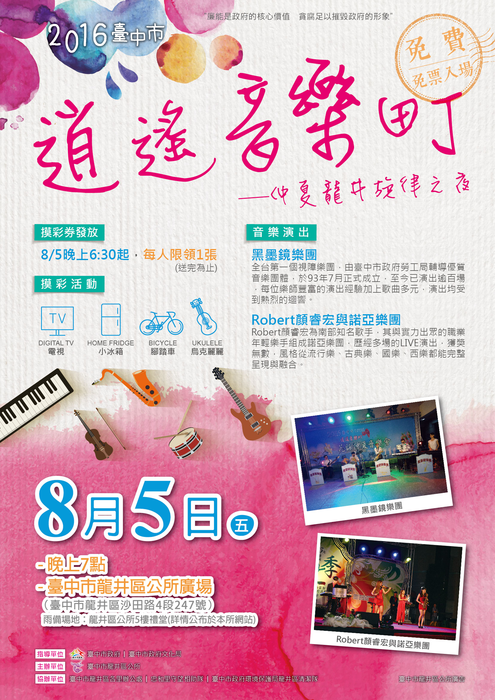 二、為擴大宣傳,敬請協助網站或跑馬燈宣傳,本案之宣傳文案為「8月5日(五)晚上7:00在龍井區公所前廣場舉辦『2016臺中市逍遙音樂町—仲夏龍井旋律之夜』,邀請黑墨鏡樂團、街頭藝人Robert顏睿宏所帶領的諾亞樂團精采音樂表演,更有多項好禮摸彩活動要送給大家,歡迎共襄盛舉!更多活動訊息請上龍井區公所網站(http://www.longjing.taichung.gov.tw/)最新消息查詢」。