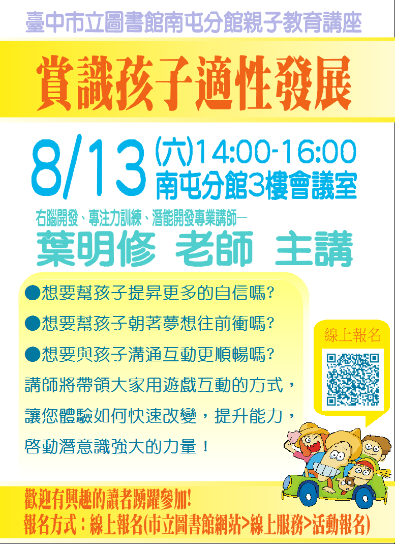 適性發展」親子教育講座,邀請具備右腦開發、專注力訓練、潛能開發專才的葉明修老師,以遊戲互動的方式帶領大家瞭解孩子的人格特質,增近親子溝通,並體驗如何快速改變、提升能力,啟動潛意識強大的力量。時間:105年8月13日(六)下午2時至4時。地點:臺中市立圖書館南屯分館3樓會議室(臺中市南屯區大墩十二街361號)。