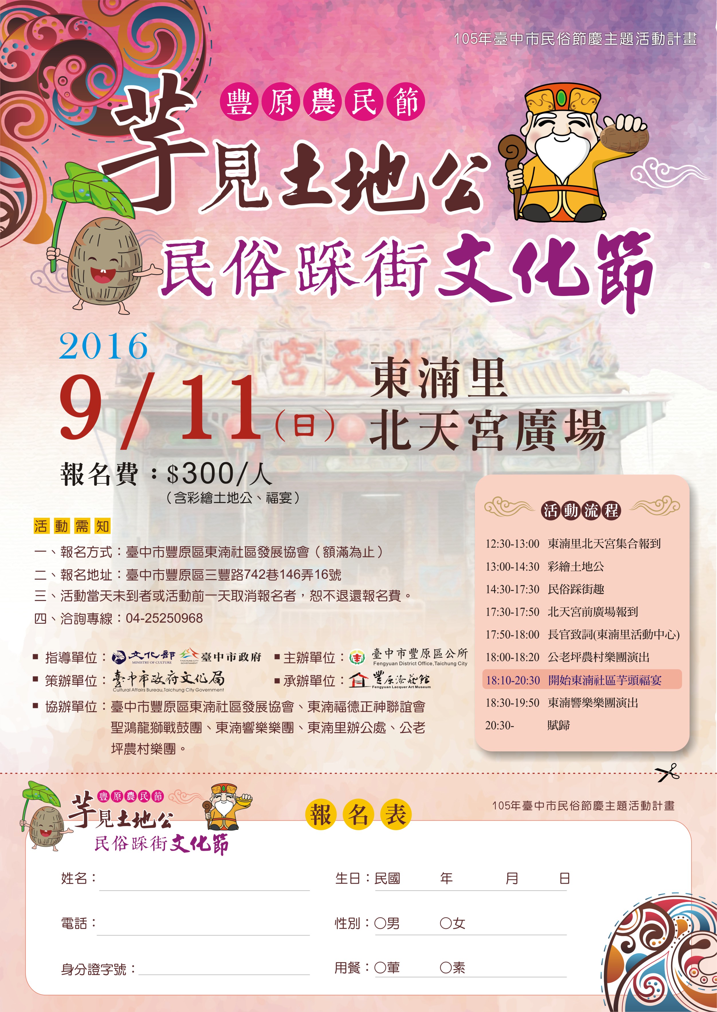 臺中市豐原區公所辦理105年度民俗節慶主題活動計畫「豐原農民節-『芋』土地公X民俗踩街文化節」活動,為發揚延續土地公精神與文化,並推廣本區東湳里在地農產品芋頭,本所與臺中市豐原區東湳里發展協會於今(105)年9月11日(日)下午共同舉辦旨揭活動,活動內容包括彩繪土地公、芋頭及土地公踩街繞境及以芋頭為主的福宴等活動,歡迎踴躍報名熱情參與,一同享受都市人文與農業社區的樣貌之美。 聯絡人:李玟欣 聯絡電話:25222106#308