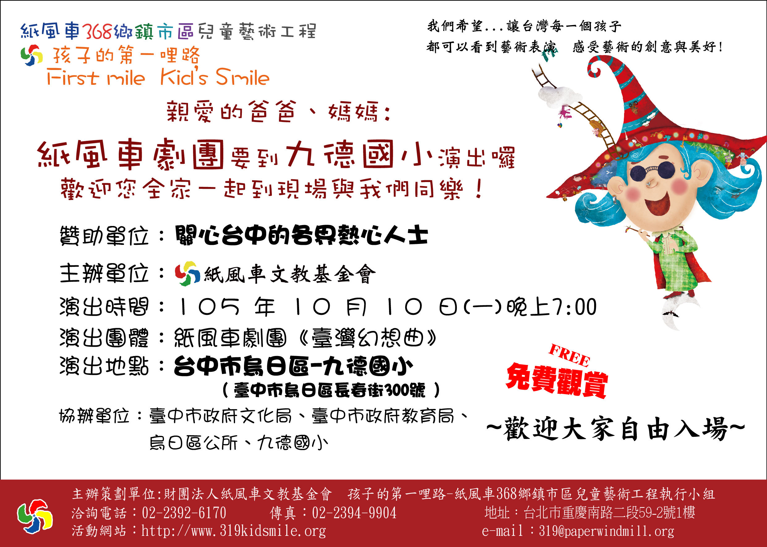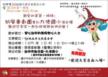 烏日區公所訂於105年10月10日(星期一)晚上7時假本區九德國小辦理「紙風車劇團-臺灣幻想曲」兒童劇巡迴活動,請踴躍參加!