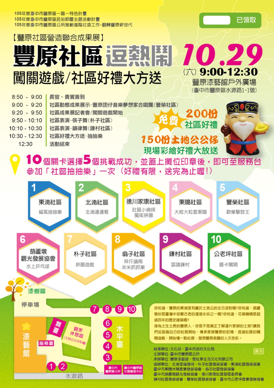一、豐原區公所辦理105年社造系列活動,結合一區一特色、區域型社造中心及民俗節慶主題活動計畫,辦理「105年度豐原區社區營造聯合成果展-豐原社區逗鬧熱」,以闖關活動方式辦理。二、活動訂於本(105)年10月29日(六)上午9時假豐原漆藝館戶外廣場舉辦旨揭活動,詳情參見活動DM。 聯絡人:李小姐 聯絡電話:25222106#308