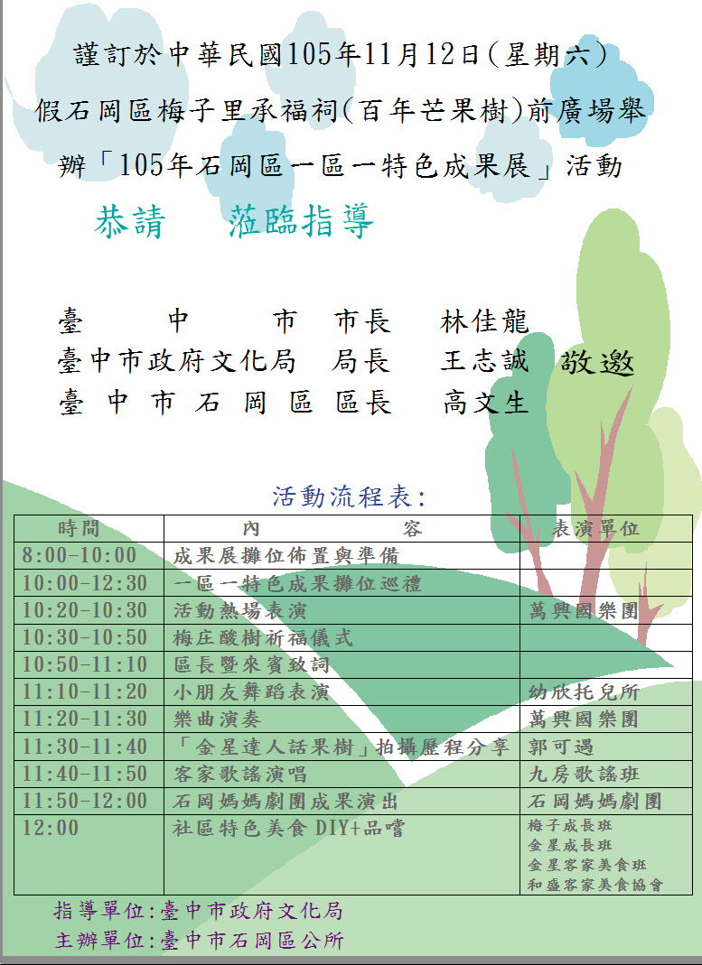 石岡區公所訂於105年11月12日(星期六)上午10時於本區梅子里承福祠(百年芒果樹)廣場辦理105年石岡區一區一特色成果展,敬邀蒞臨指導!