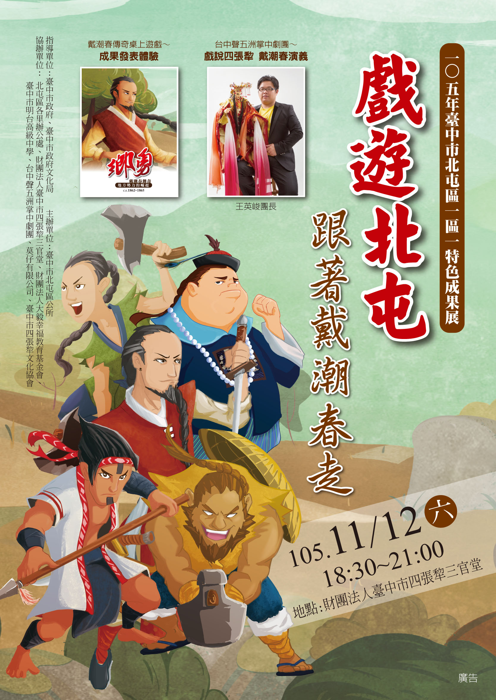 臺中市北屯區公所辦理105年臺中市北屯區一區一特色計畫「戲遊北屯~跟著戴潮春走」成果展,一、活動時間:105年11月12日(星期六)18:30~21:00。