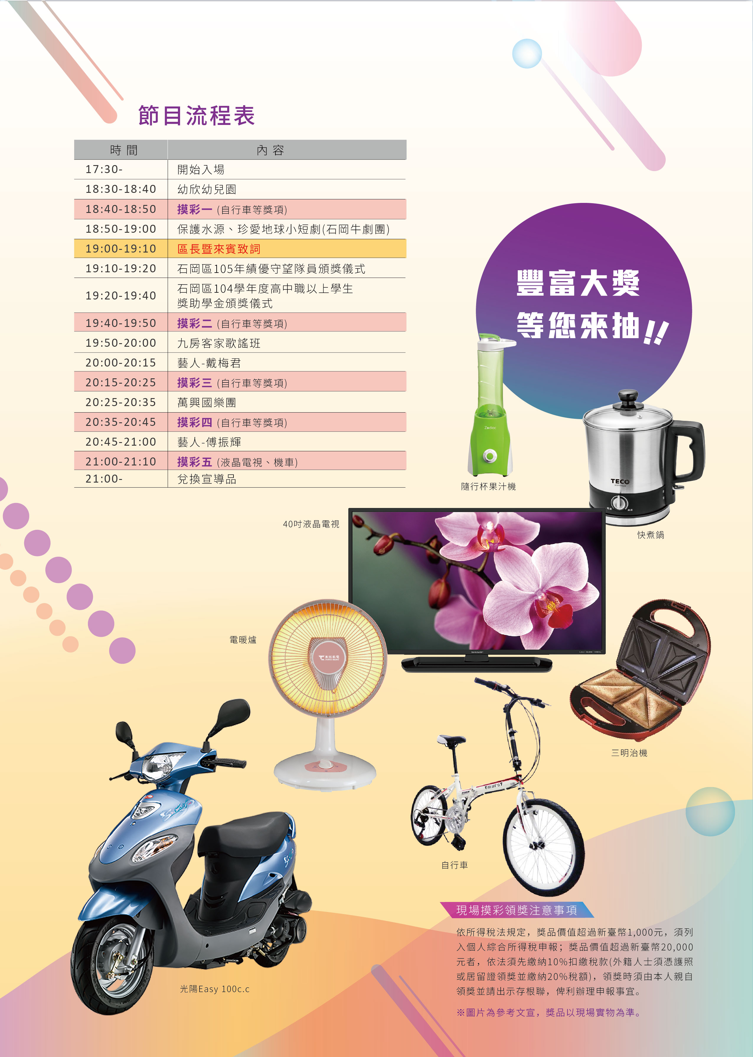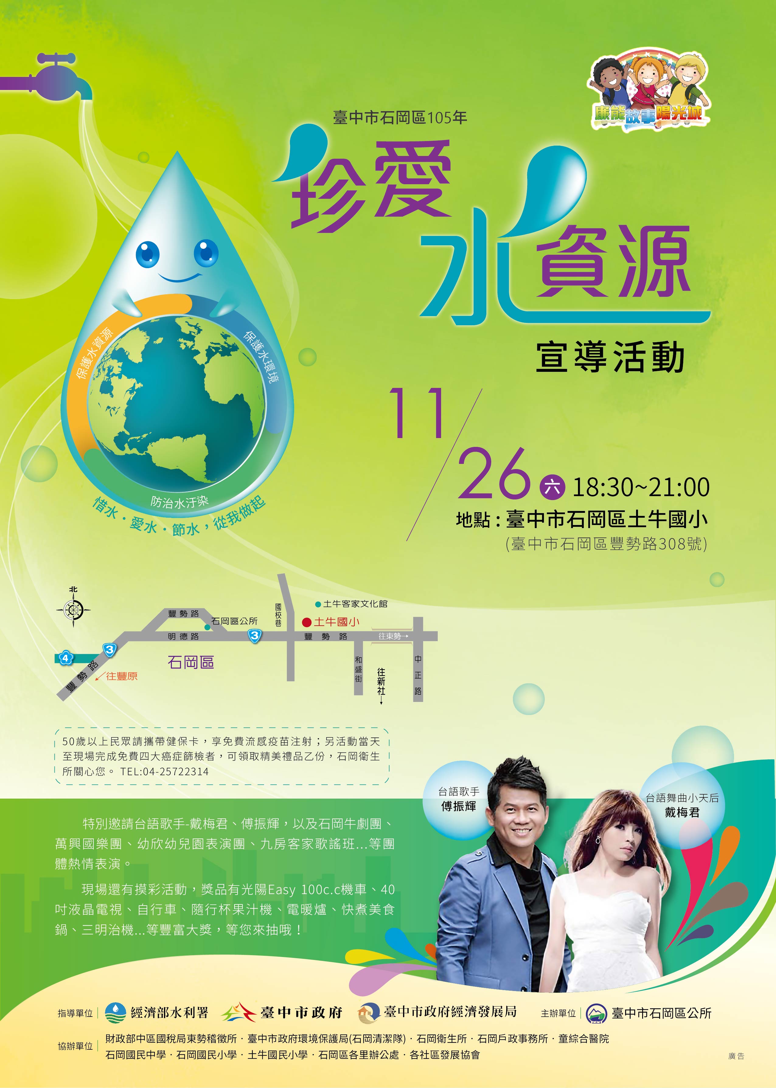 「臺中市石岡區105年珍愛水資源宣導活動」精彩可期,活動當天請到台語歌手傅振輝、董育君、萬興國樂團、幼欣幼兒園、九客家歌謠班及石岡牛劇團熱情演出、還有水資源宣導有獎徵答、摩托車等大獎摸彩,節目精彩、趣味十足、獎品豐富,敬請大家踴躍參加,歡迎各界一起來共襄盛舉。