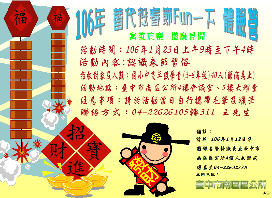 p.s 請於106年1月12日前將報名資料繳交至臺中市南區區公所4樓人文課或傳真至04-22632778。