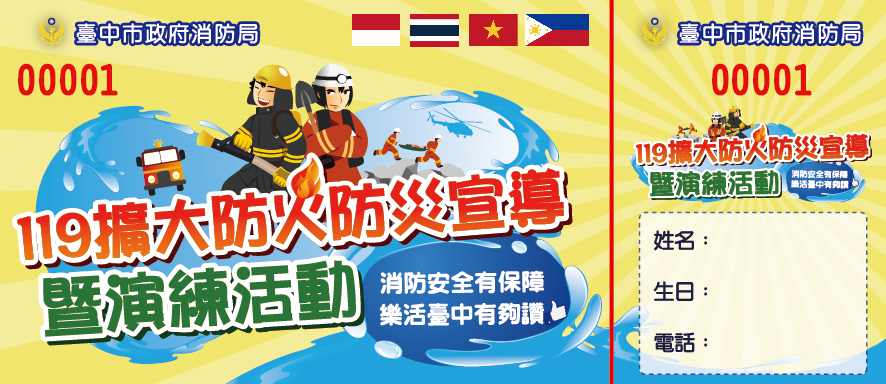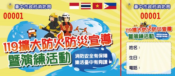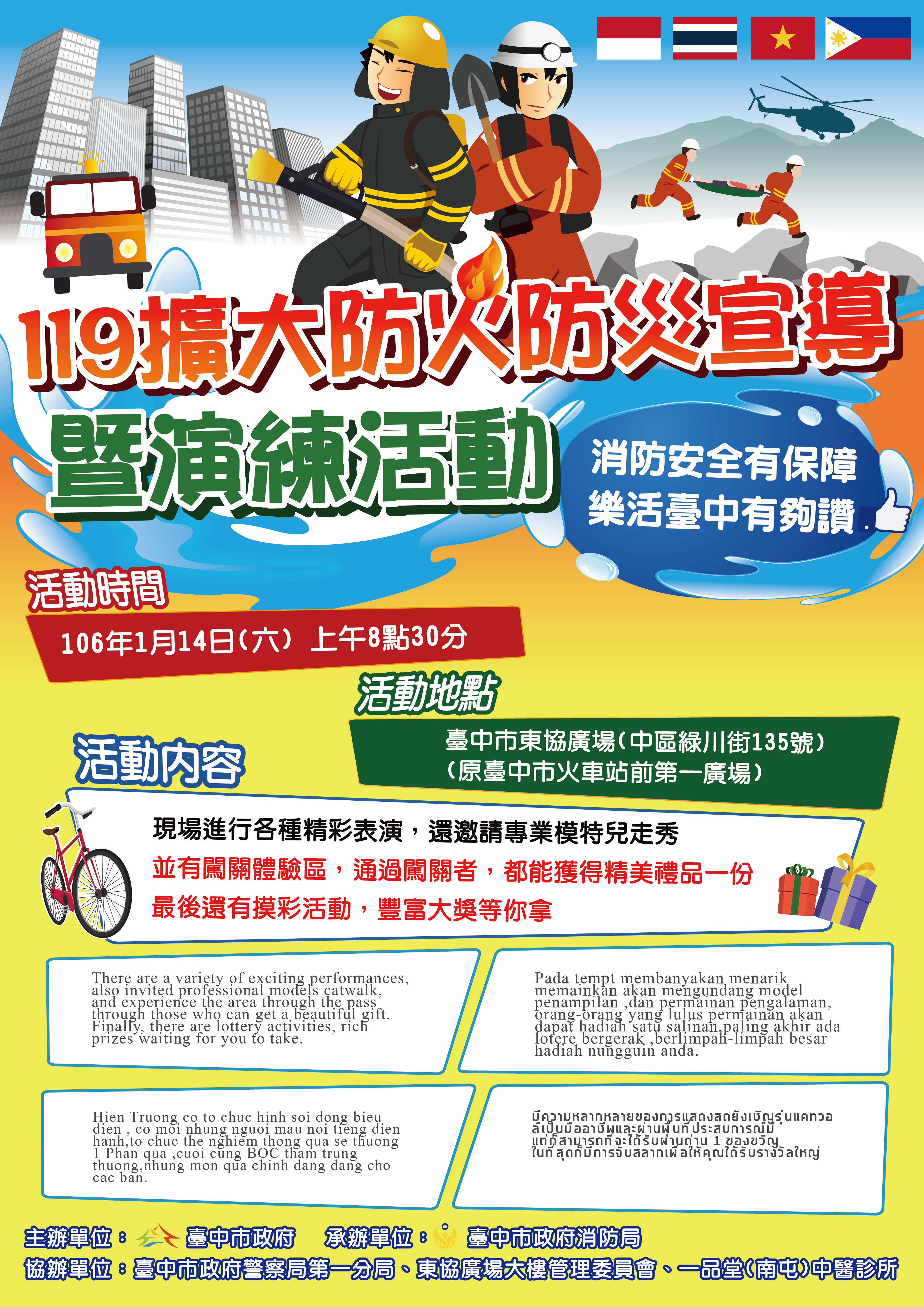 消防局106年度119擴大防火防災宣導暨演練活動–「消防安全有保障,樂活臺中有夠讚」,現場將架設舞台表演創意舞蹈及防火防災宣導短劇以外,並邀請到專業模特兒到場,穿著各式臺中消防新式服制走秀,還有東協廣場大樓自衛消防編組演練及各式消防闖關體驗區等,今年另外還特別舉辦了小朋友消防寶可夢遴選活動(開放30個名額,供本市4-10歲小朋友報名),寓教於樂以打造友善安全城市為目標,確保民眾平安歡度農曆新年。 活動時間:106年1月14日星期六08:30~13:30。 *9點25分:第1次抽獎活動 *12時50分:第2次抽獎活動 聯絡人:童小姐 聯絡電話:04-23811119分機468