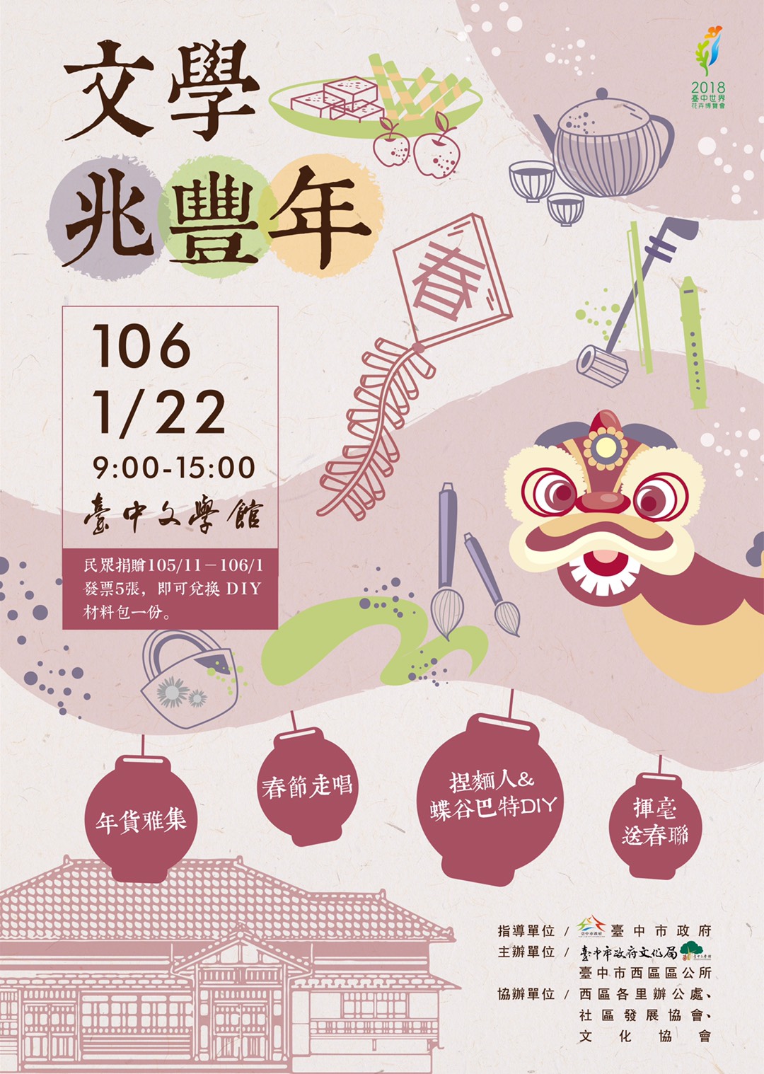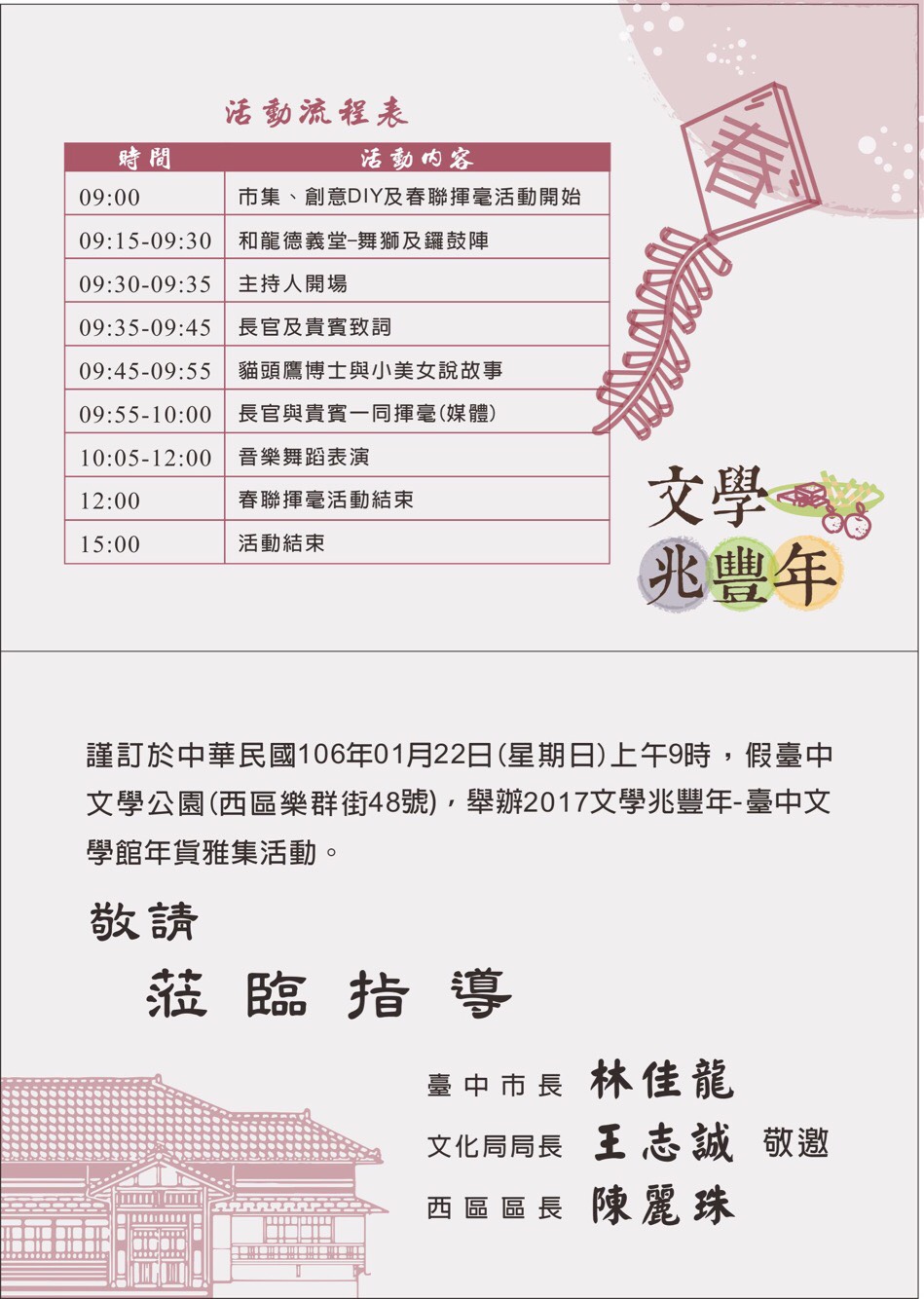 西區區公所辦理「2017文學兆豐年-臺中文學館年貨雅集活動」,惠請協助活動文宣於貴單位網站上公告宣傳,並竭誠歡迎蒞臨指導,請查照。