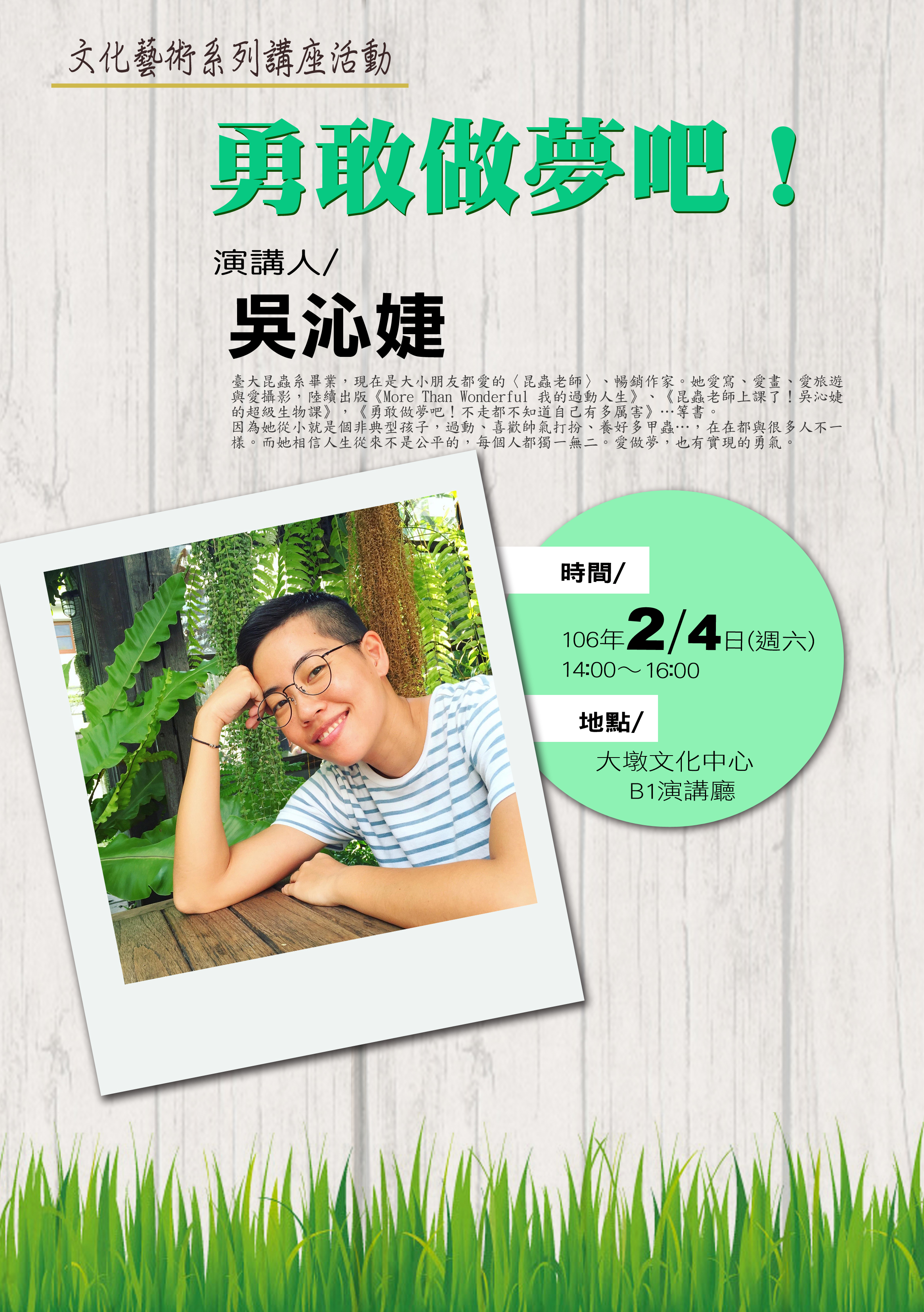 大墩文化中心邀請昆蟲老師吳沁婕以「勇敢做夢吧」為題,進行講座活動,歡迎踴躍參加!