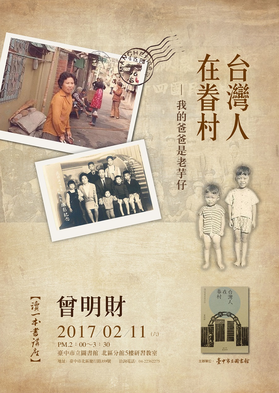 一、第一場講座邀請作家曾明財分享「台灣人在眷村--我的爸爸是老芋仔」,以眷村孩子的身分,娓娓道來那獨特的生活經驗。(一)時間:106年2月11日(六)下午2時至3時30分。(二)地點:本館北區分館(臺中市北區健行路359號)。二、第二場講座邀請彩墨畫家于傳騏分享「藝術上的美與醜」,帶領民眾從不同的觀點觸動審美的感受。(一)時間:106年2月26日(日)下午2時至3時30分。(二)地點:本館大里分館(臺中市大里區中興路1段163號)。三、公教人員全程參與者核予終身學習時數2小時。 聯絡人:曾敬傑 聯絡電話:0424225101#507