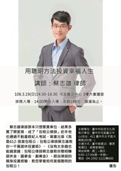 屯區藝文中心訂於106年3月19日(日)舉辦蔡志雄律師講座「用聰明方法投資幸福人生」,敬請踴躍參加!