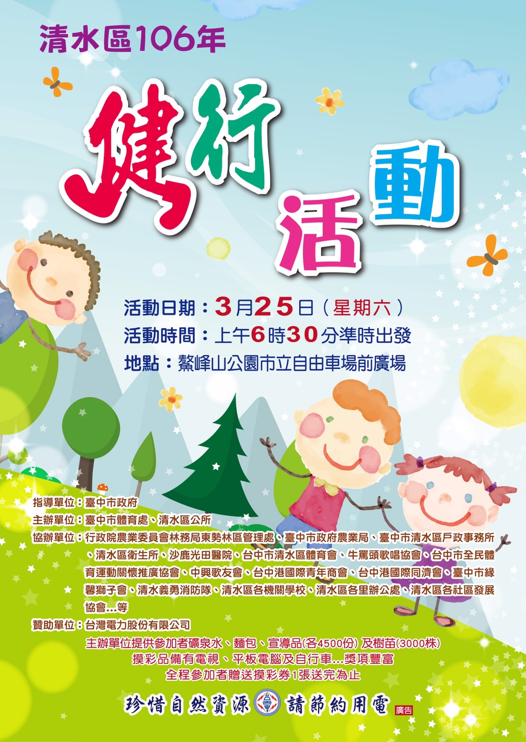 「清水區106年健行活動」宣傳海報乙張,敬邀貴單位蒞臨指導並請張貼宣傳周知,請查照。,