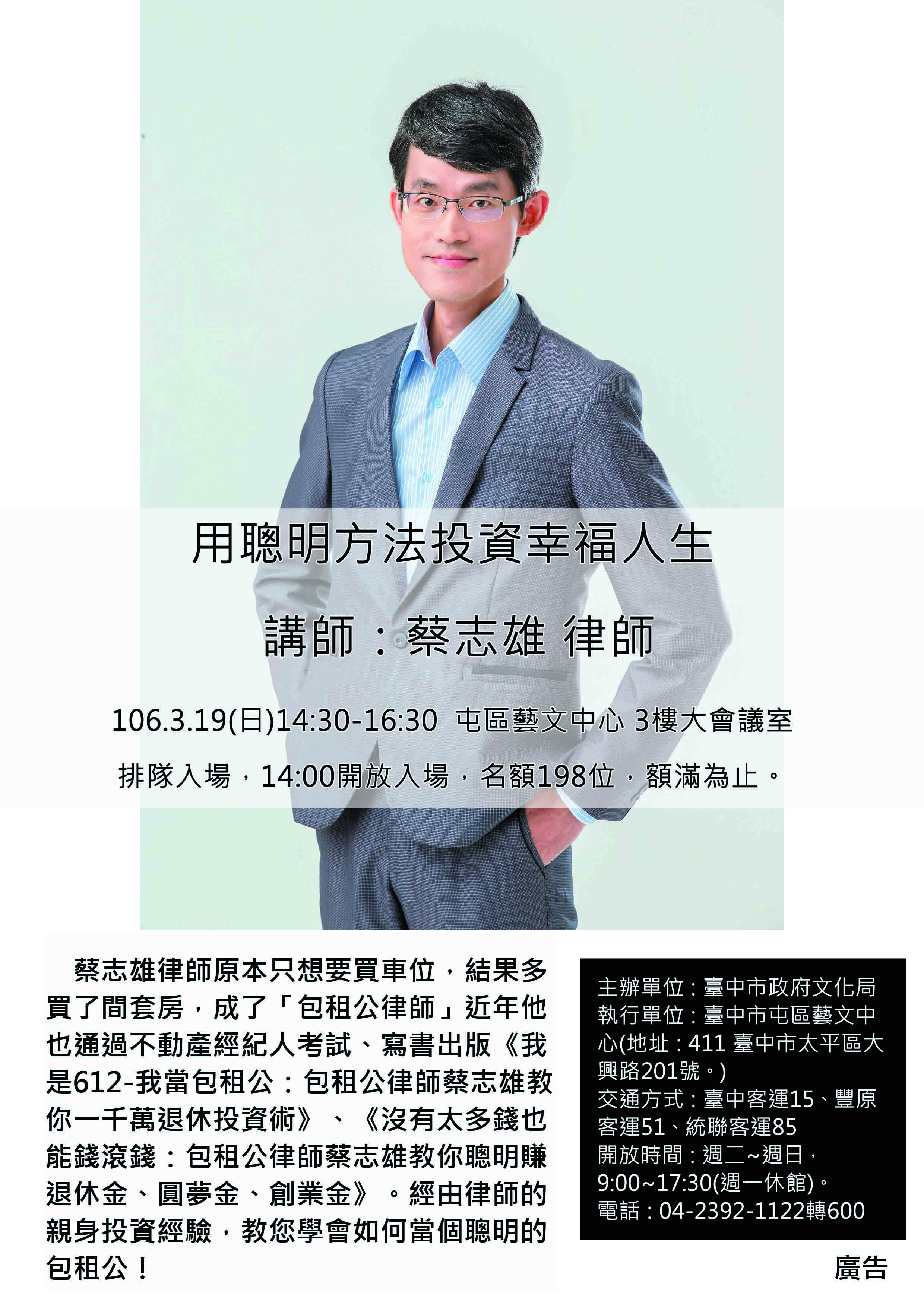 屯區藝文中心訂於106年3月19日(星期日)舉辦蔡志雄律師講座「用聰明方法投資幸福人生」,蔡志雄為現職律師、不動產經紀人、好房網、Yahoo奇摩房地產、女人變有錢、鉅亨網專欄作家,著有《我是612--我當包租公》等書籍。活動時間:106年3月19日(星期日)14:30-16:30活動地點:屯區藝文中心3樓大會議室(臺中市太平區大興路201號),採排隊入場,座位198席,額滿為止。歡迎民眾踴躍前往參加。 聯絡人:葉芷秀 聯絡電話:04-23921122#112