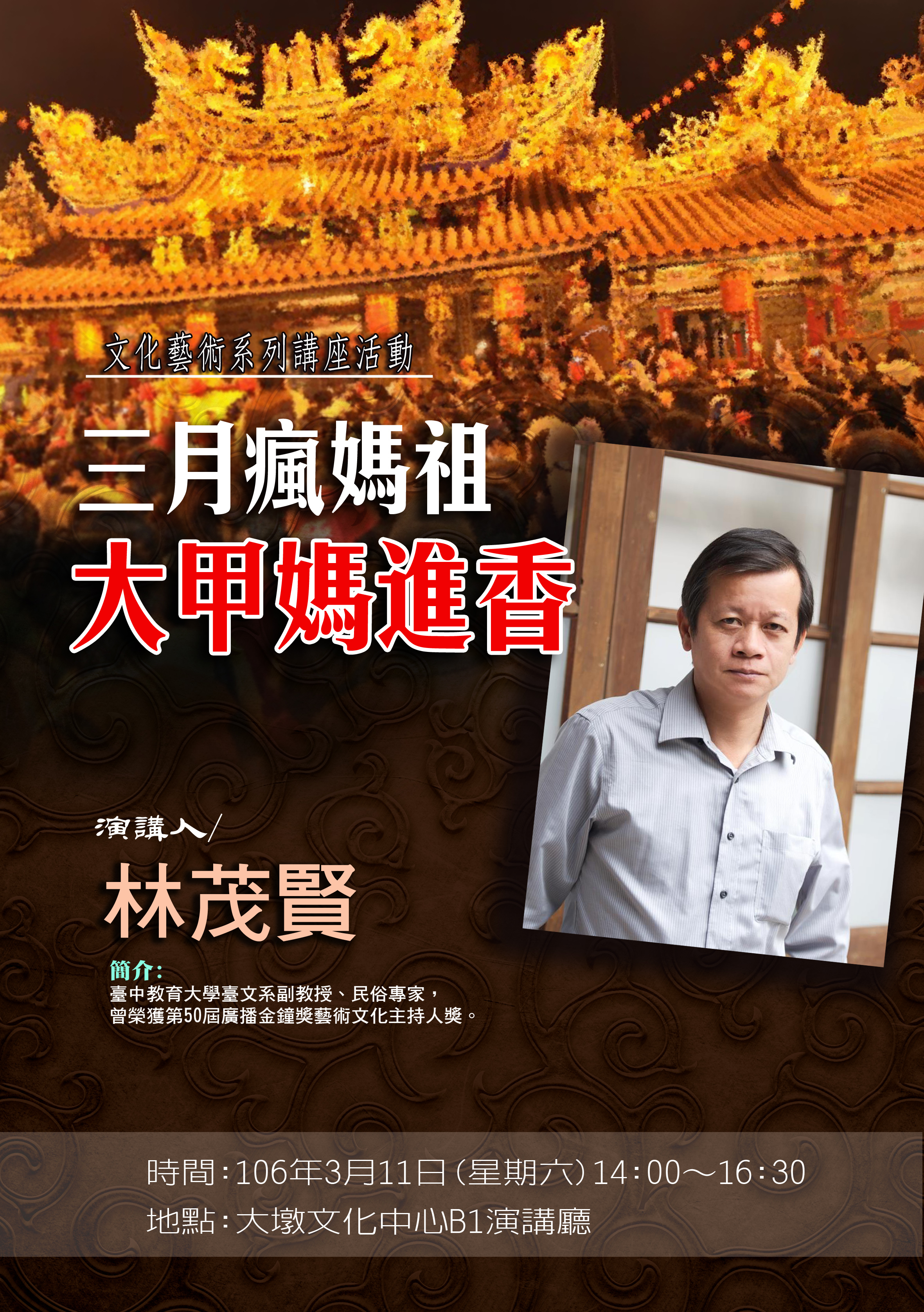 大甲媽祖遶境活動即將登場,大墩文化中心邀請林茂賢教授以「三月瘋媽祖-大甲媽進香」為題,與大家分享在9天8夜340多公里的遶境活動,其中的獻敬禮儀典故緣由、歷史以及小故事。邀請您前來聆聽,讓林教授告訴您,為什麼身為一個台灣囝仔你此生一定要去一次「大甲媽祖遶境」。