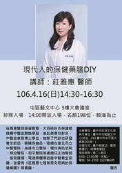 屯區藝文中心訂於106年4月16日(星期日)舉辦莊雅惠醫師講座「現代人的保健藥膳DIY」,莊醫師為莊雅惠中醫診所院長、漢補世家中醫顧問、中國電視台「生活新鮮報」、復興電台「生活百分百」、漢聲電台「幸福家族」養生主講人。著有《莊雅惠七種常見文明病的保健藥膳》等書籍。