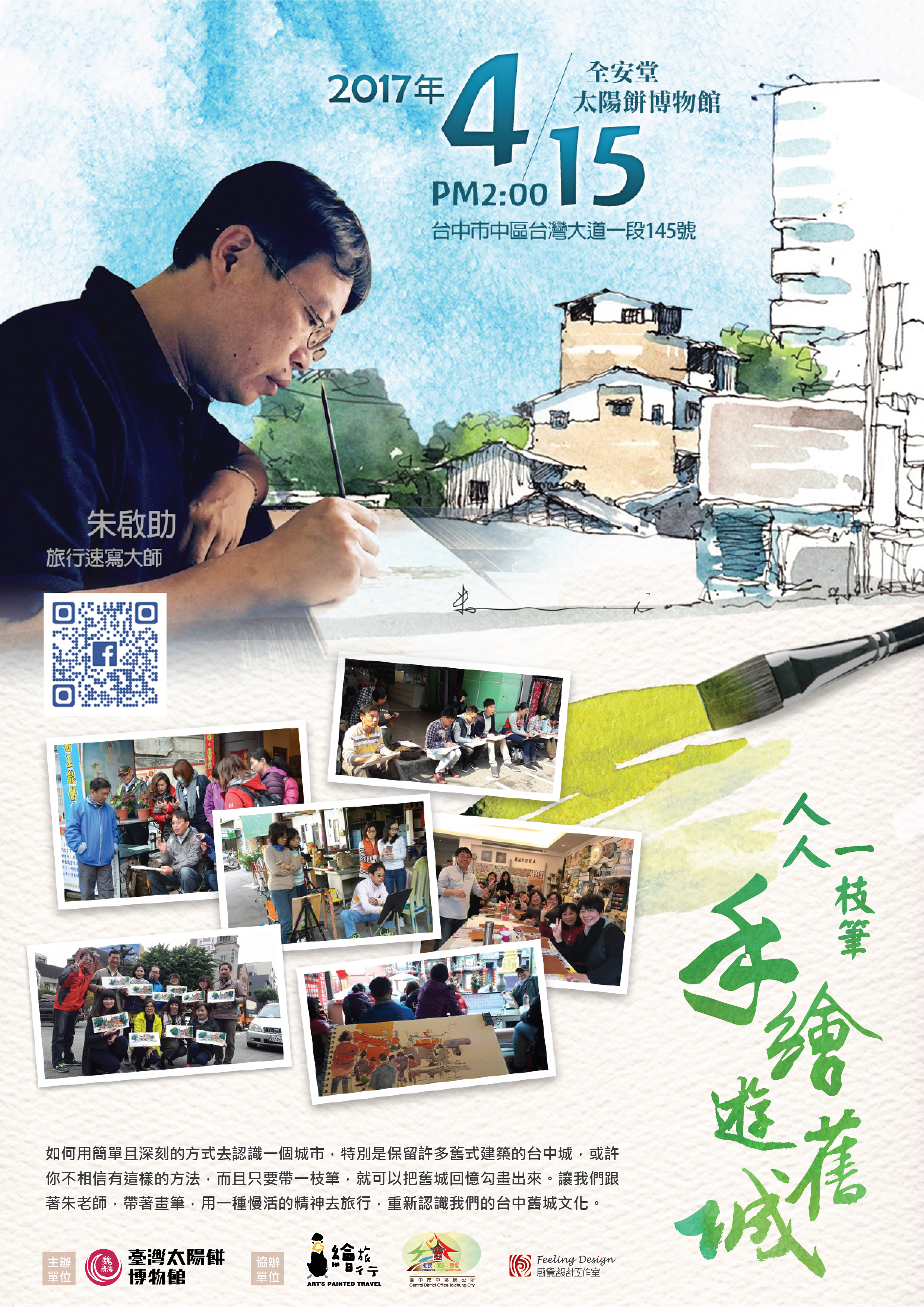 中區區公所與全安堂臺灣太陽餅博物館訂於106年4月15日(星期六)下午2時舉辦「人人一枝筆 手繪遊舊城」講座,特別邀請朱啟助老師擔任講師,內容為如何用簡單且深刻的方式去認識保留許多舊式建築的臺中城,用一種慢活的精神去旅行,重新認識我們的臺中舊城文化。講座時間:106年4月15日(星期六)下午2時至4時。講座地點:全安堂臺灣太陽餅博物館2樓(臺中市中區臺灣大道1段145號)。歡迎民眾踴躍前往參加。 聯絡人:詹詠涵 聯絡電話:04-22222502