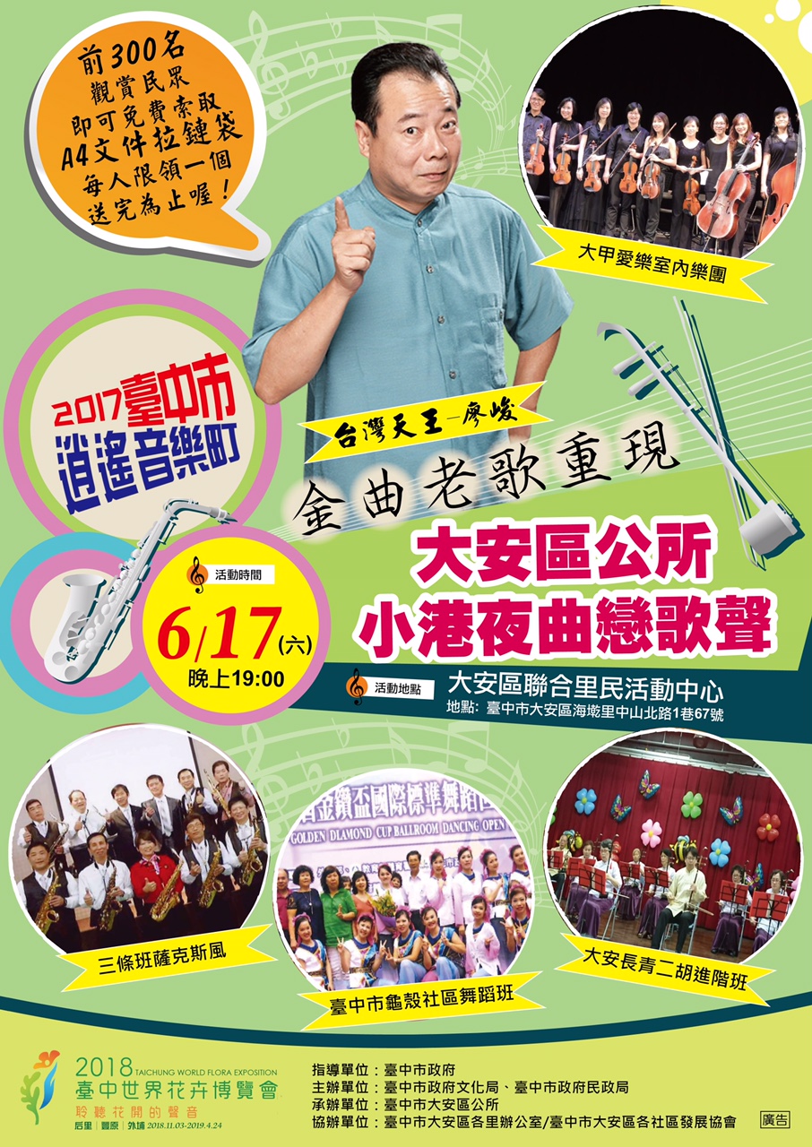 臺中市大安區公所謹訂於106年6月17日(星期六)晚上 7:00於臺中市大安區聯合里民活動中心廣場(臺中市大安區海墘里中山北路1巷67號)舉辦2017臺中市逍遙音樂町-小港夜曲戀歌聲音樂會暨市政宣導,敬請蒞臨指導。 聯絡人:陳炤妤 聯絡電話:04-26713511(517)