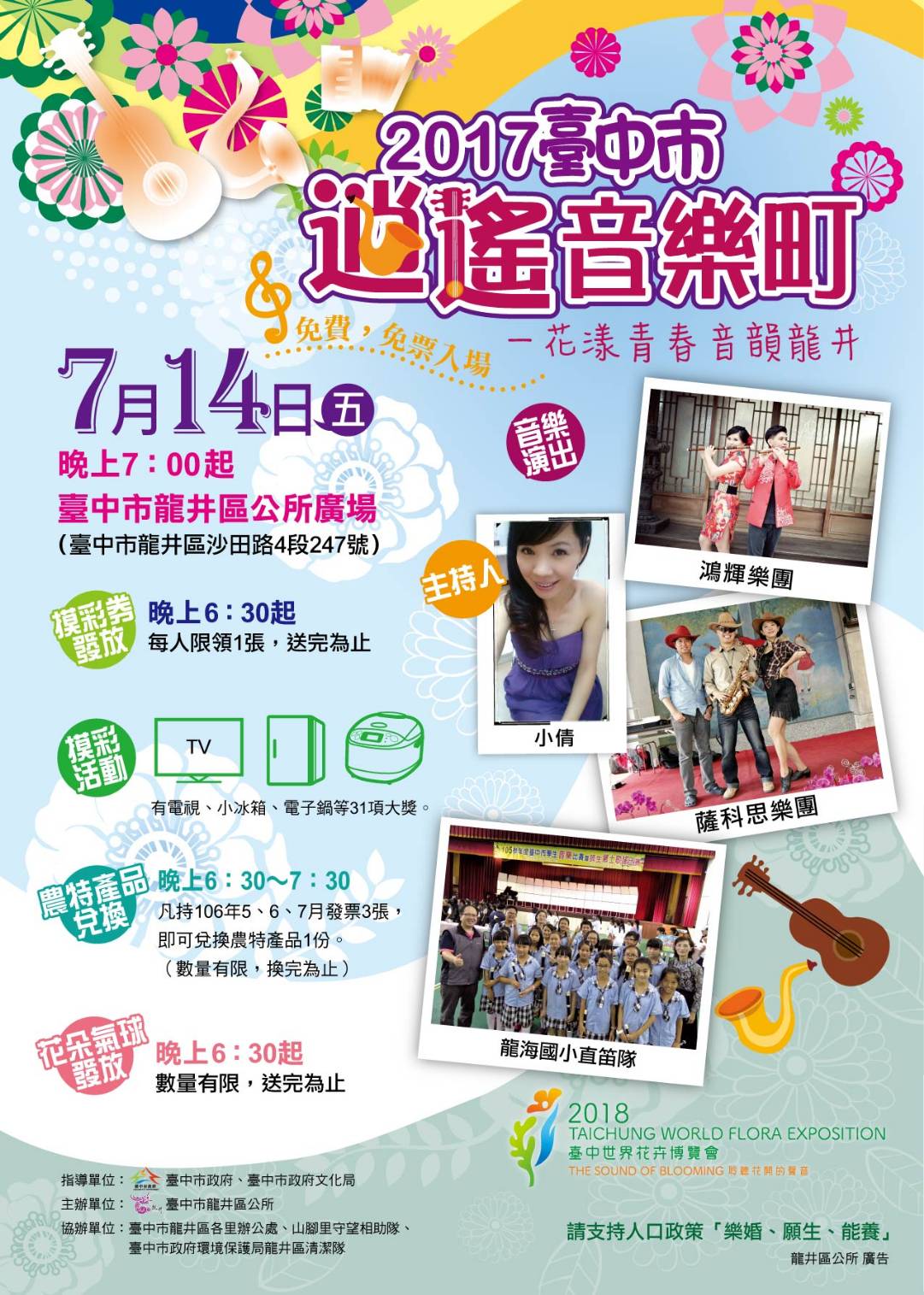 臺中市龍井區公所訂於106年7月14日(星期五)晚上7時舉行「2017臺中市逍遙音樂町─花漾青春音韻龍井」音樂晚會,歡迎踴躍參加。