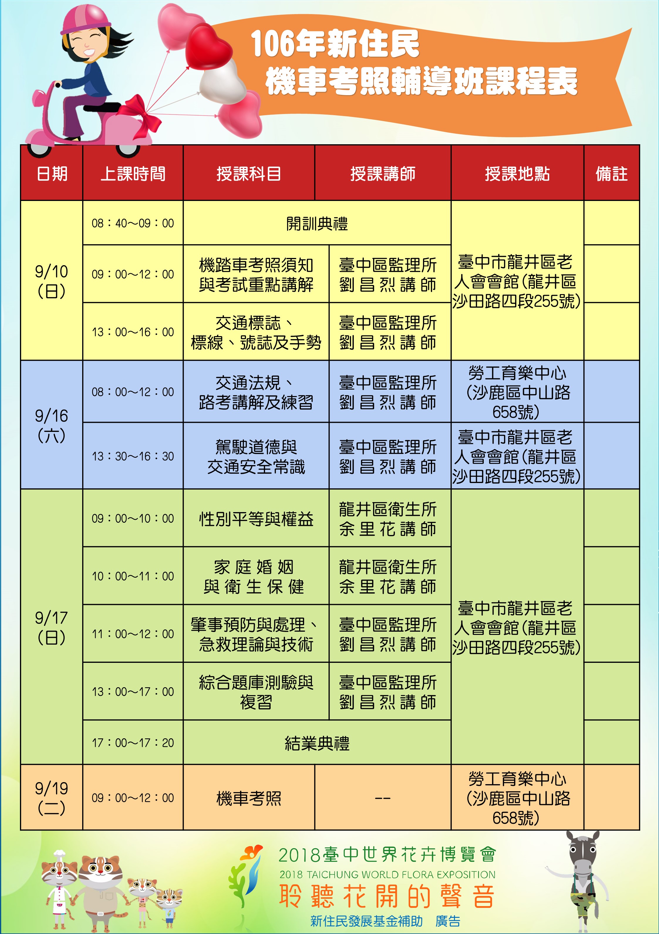 招生對象:臺灣地區人民之配偶為未入籍之外國人、無國籍人、大陸地區人民及香港澳門地區居民(居留證期限滿一年以上者),或已入籍為我國國民,未有機車駕駛執照者,招生人數15人。