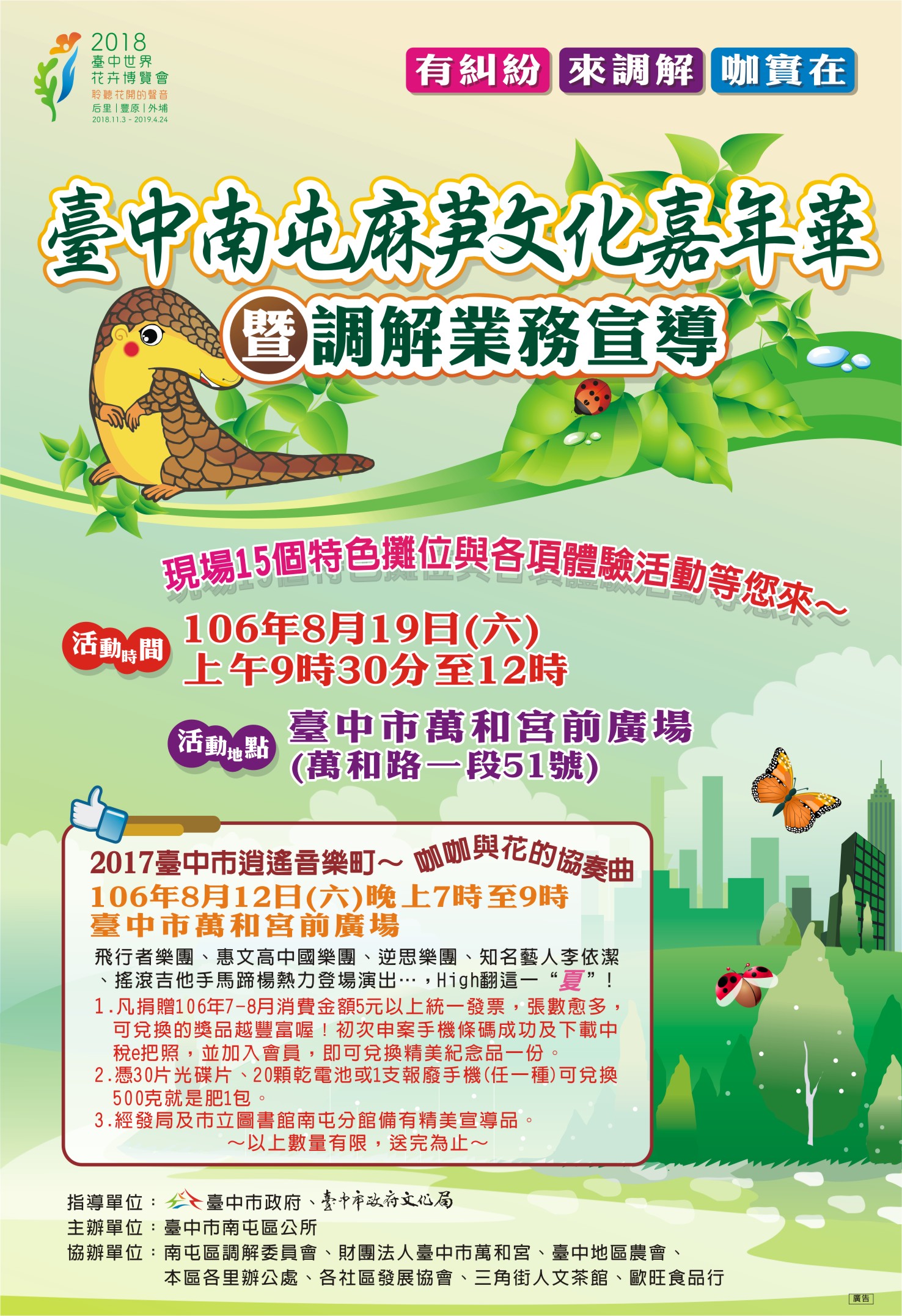 一、「106年臺中南屯麻芛文化嘉年華暨調解業務宣導」活動訂於106年8月19日(星期六)上午9時30分至12時在本市南屯區臺中市萬和宮前廣場辦理,規劃精采舞臺表演、麻芛美食市集、南屯旅遊讚大富翁遊戲及DIY體驗等民俗節慶暨產業推廣活動,歡迎大家踴躍參與。