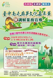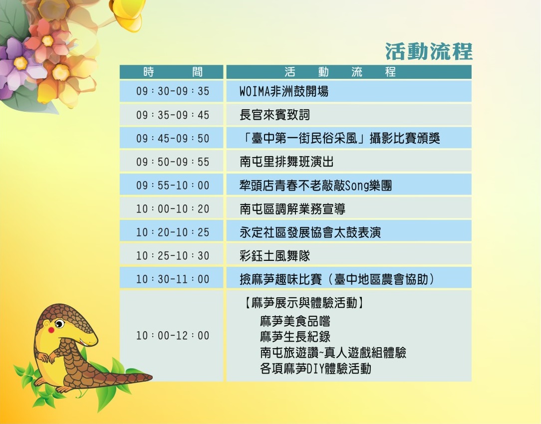 二、檢附「106年臺中南屯麻芛文化嘉年華暨調解業務宣導」海報及活動流程電子檔一份。
