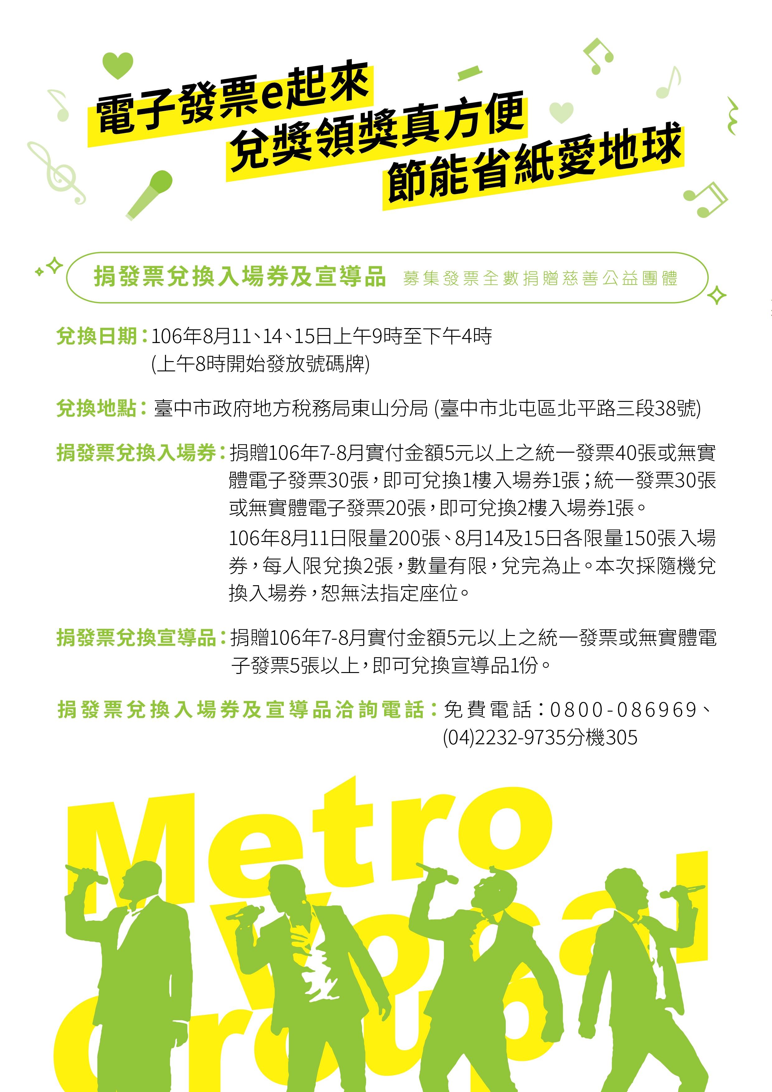 臺中市政府地方稅務局東山分局訂於106年10月22日(星期日)假臺中市中山堂舉辦「2017花都藝術季-花饗稅樂 璀璨人聲 Metro Vocal Group演唱會」,並於8月11、14、15日舉辦捐發票兌換入場券活動,詳情請上稅務局網站查詢。